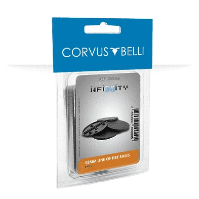 Pack of x5 55mm bases. Designed exclusively for Infinity miniatures, with Line of Fire markings displayed on the base.
