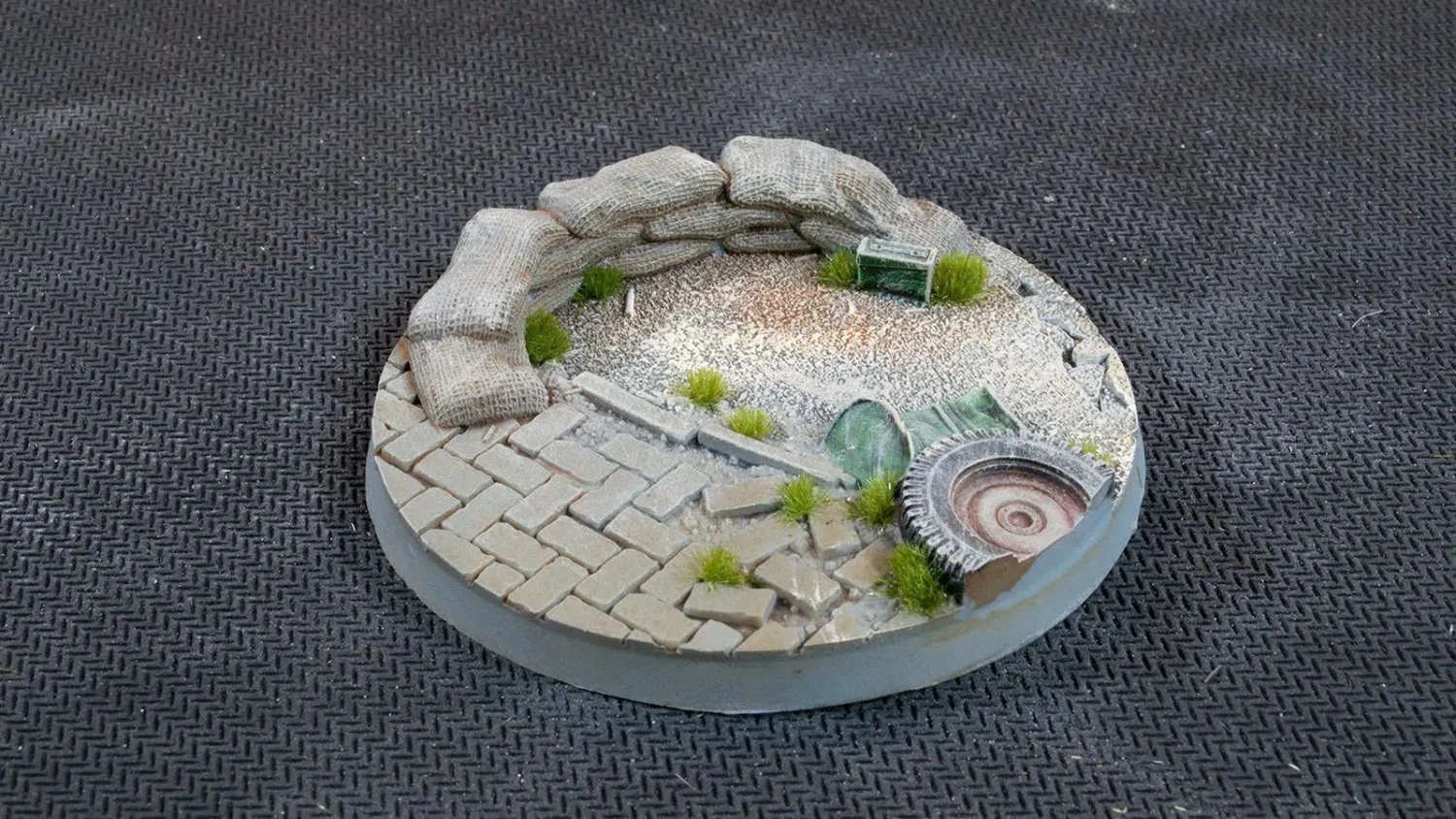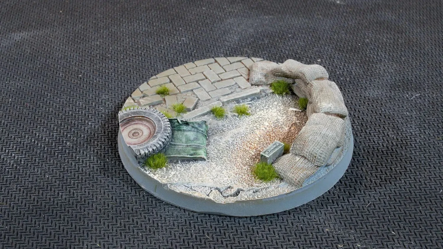 Dusty streets with broken asphalt, loose sidewalk bricks, abandoned wheels, sandbags, trenches, fuel drums and debris overrun by small herbs and mosses. These bases are perfect for all urban war backgrounds, from the Great Wars to sci-fi future conflicts.