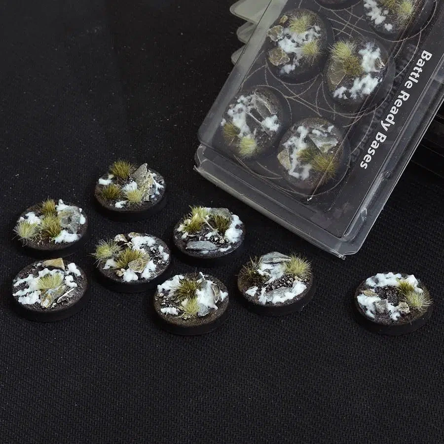 This pack contains 8 round Battle Ready Bases 32mm wide in a winter theme.