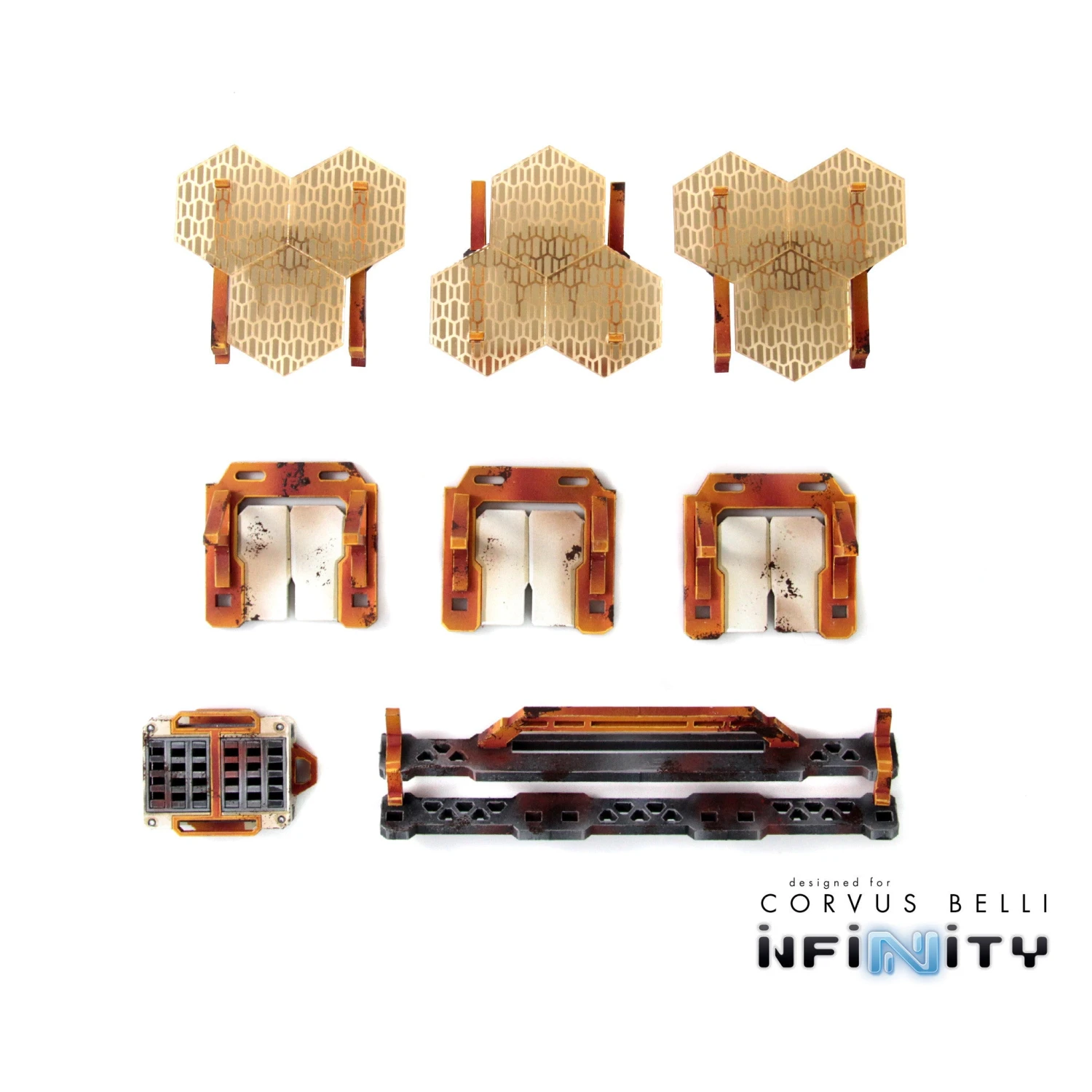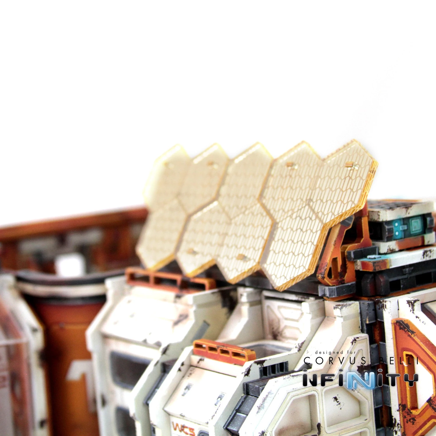The Solar Array can be free-standing scatter terrain, or can be added to the roof of any of the Cosmica buildings for added detail and cover. Choose between acrylic Solar Panels and MDF Impact Shields.