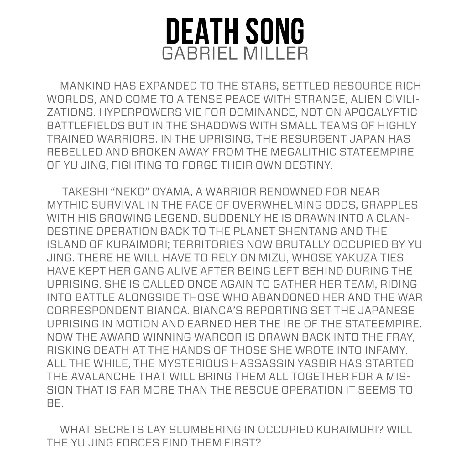 Takeshi “Neko” Oyama, a warrior renowned for near mythic survival in the face of overwhelming odds, grapples with his growing legend. Suddenly he is drawn into a clandestine operation back to the planet Shentang and the island of Kuraimori; territories now brutally occupied by Yu Jing. There he will have to rely on Mizu, whose yakuza ties have kept her gang alive after being left behind during the Uprising. She is called once again to gather her team, riding into battle alongside those who abandoned her and the war correspondent Bianca. Bianca’s reporting set the Japanese Uprising in motion and earned her the ire of the StateEmpire. Now the award winning warcor is drawn back into the fray, risking death at the hands of those she wrote into infamy. All the while, the mysterious Hassassin Yasbir has started the avalanche that will bring them all together for a mission that is far more than the rescue operation it seems to be.