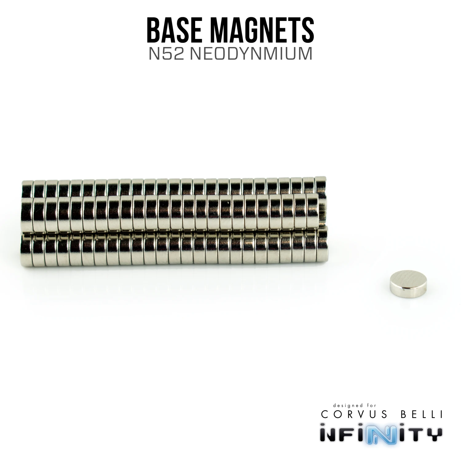 These magnets fit perfectly with the magnet holes in all of our bases. They also fit perfectly in the bases from Corvus Belli. These magnets measure 3/16 in x 1/16 in, and are sold in singles or packs of 100.