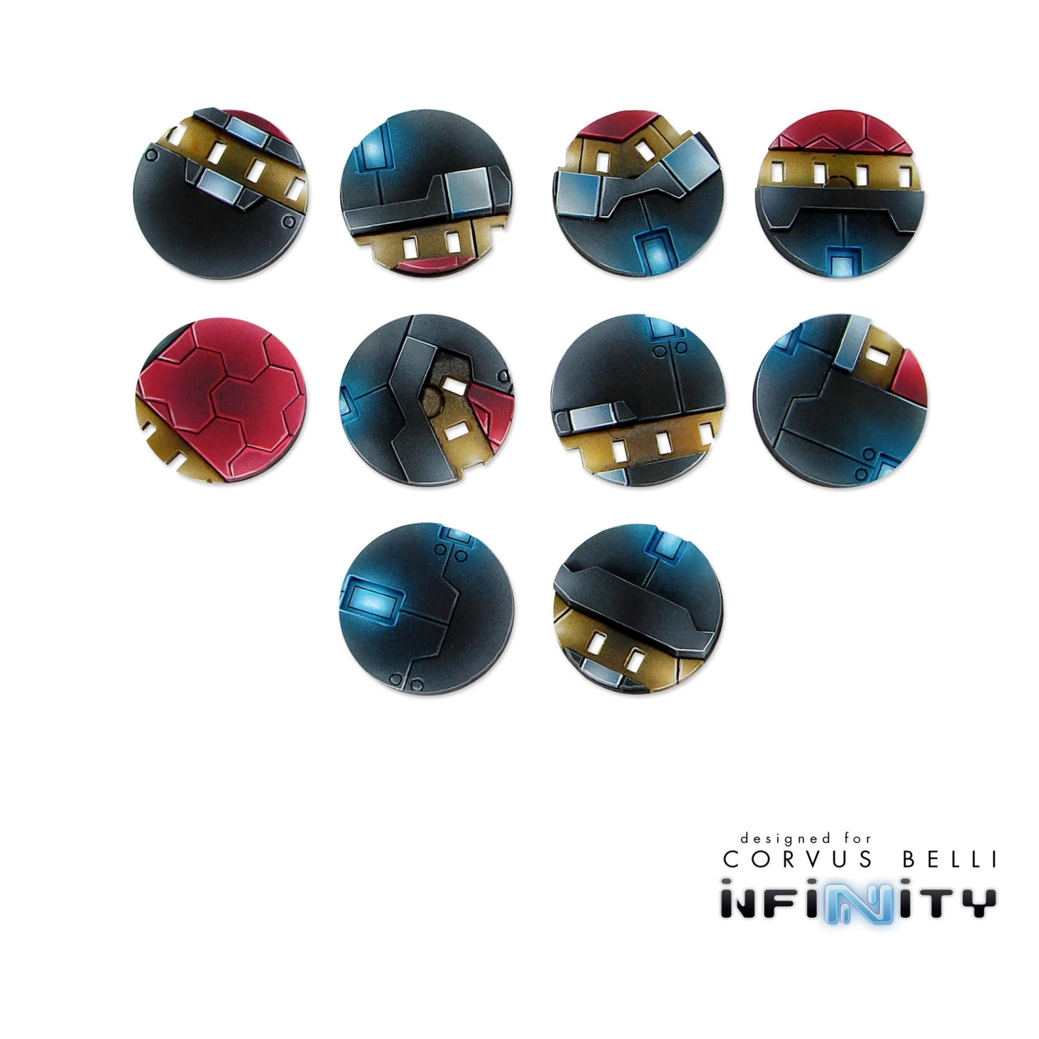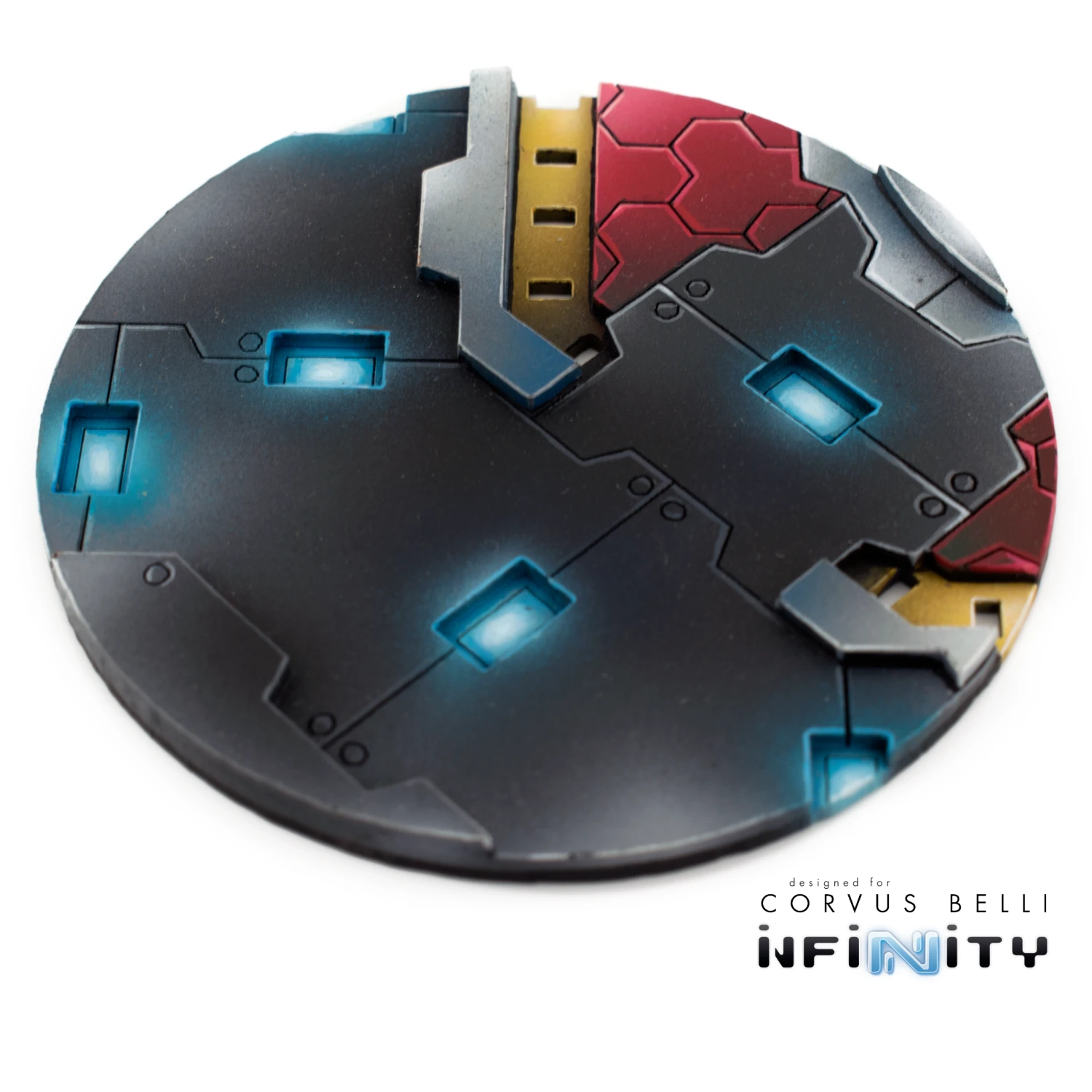 The bases can be mounted on standard Corvus Belli bases that you can magnetize for transport using our Rare Earth Magnets. They are lined up to work perfectly with our Infinity Status Discs.