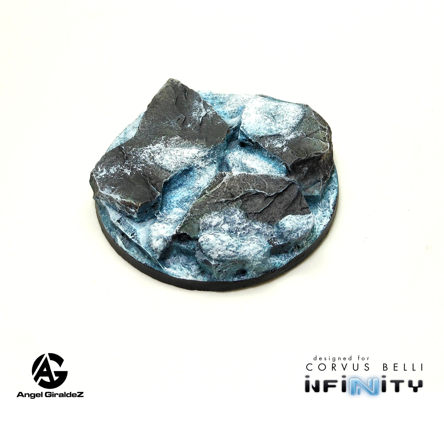 Resin bases come unpainted. We recommend washing the bases thoroughly before painting. Please note snow effects were added to the bases pictured. The sculpt only contains rocks.
